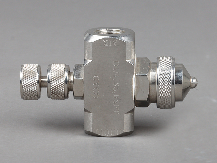 1、空氣霧化噴嘴特殊的內部結構設計能使液體和氣體均勻混合,產生微細液滴尺寸的噴霧或粗液滴噴霧。通過增加氣體壓力或降低液體壓力可得到更加微細 (30微米左右)的液滴噴霧,從而達到較高的氣體流率與液體流率比